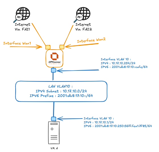 Chacun des liens internet aura plusieurs préfixe globaux, routé sur internet et donc associé à ces liens. Ces préfixes sont configurés pour être routé à destination de la vm Opnsense sur la box du voisin, et obtenu dynamiquement pour l'accès porté directement par ma vm (/60 pour le WAN1, /61 pour le Wan2).