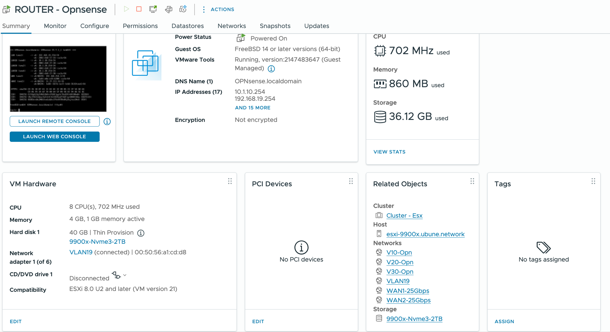 Sur l’hôte ESXi, une VM OPNsense, qui est donc un Routeur/Firewall assure :