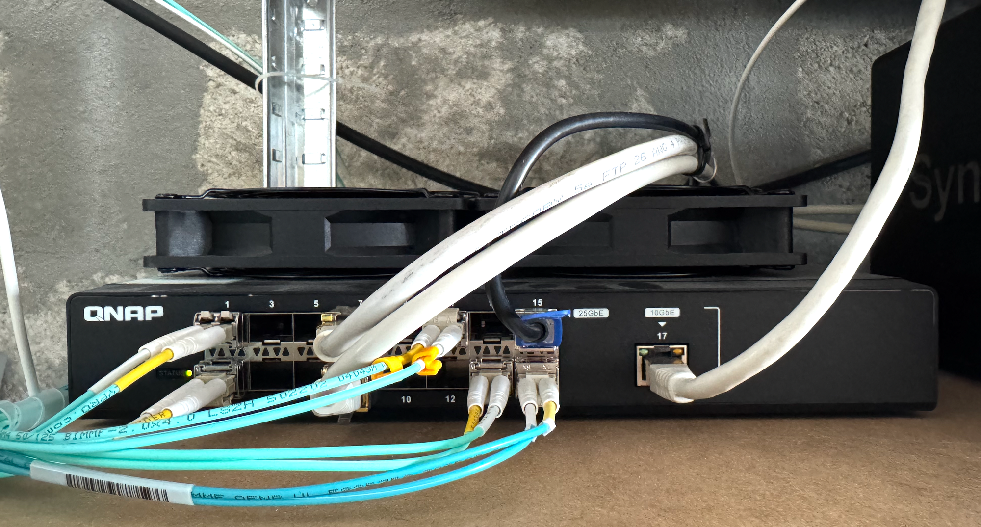 Le Switch est un modèle Qnap qui sait encaisser 16 Ports 25Gbps (le fond de panier tient la cadence) il présente des fonctionnalités limités mais parfaitement satisfaisantes pour mon environnement (il supporte les vlan et le protocole lacp par exemple).