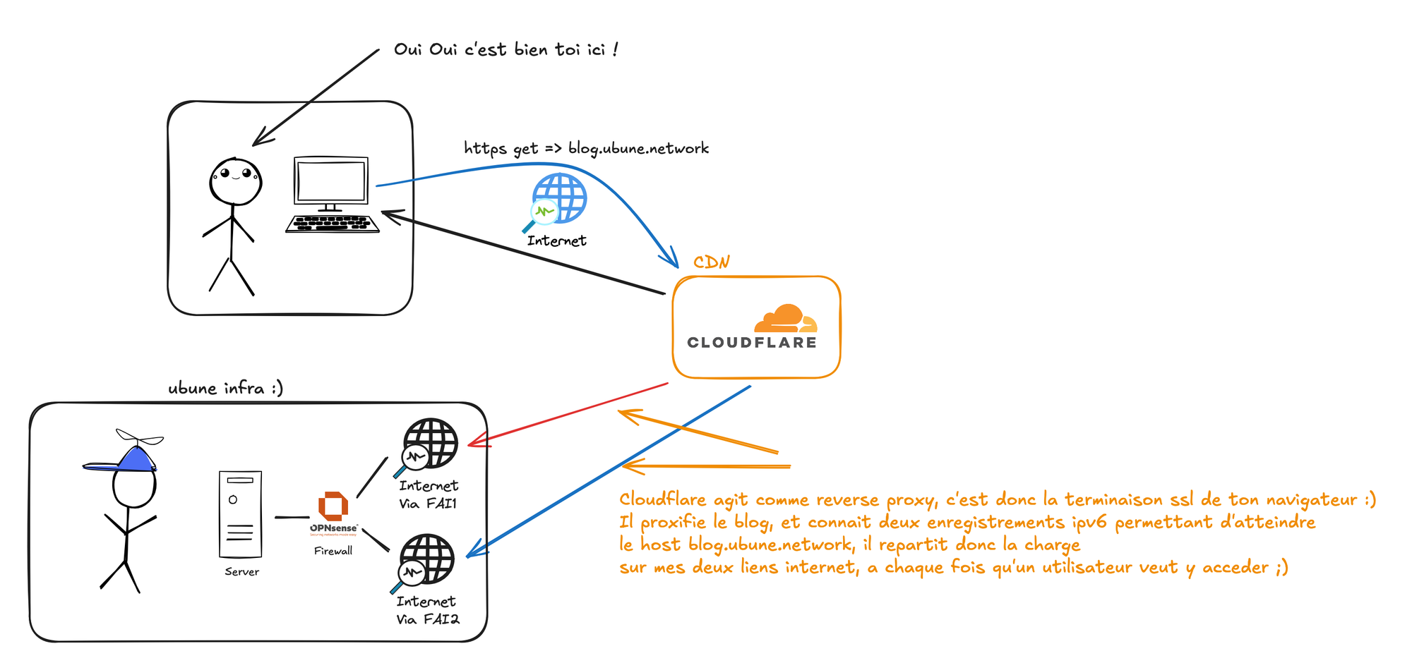 Pour detailler comment fonctionnent les flux entrants, on peut le schématiser avec ton exemple, si tu lis ces lignes, c'est que tu as cliqué sur le lien https://blog.ubune.network, ta requête est donc passée d’abord par Internet et arrive chez le CDN Cloudflare.