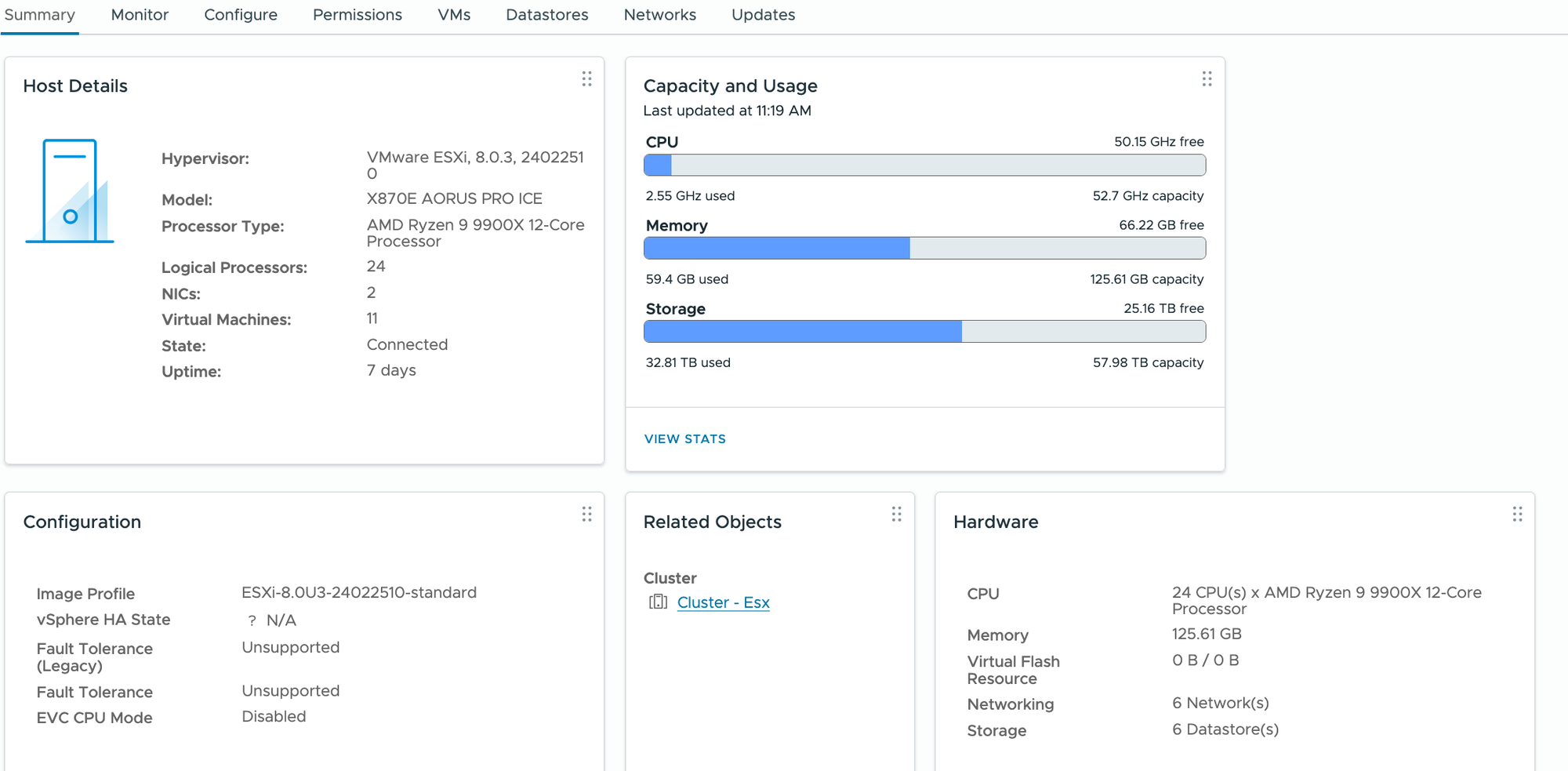 Mon setup repose sur un Serveur ESXi "custom", monté comme une tour "gaming" mais optimisé pour la virtualisation et le réseau :