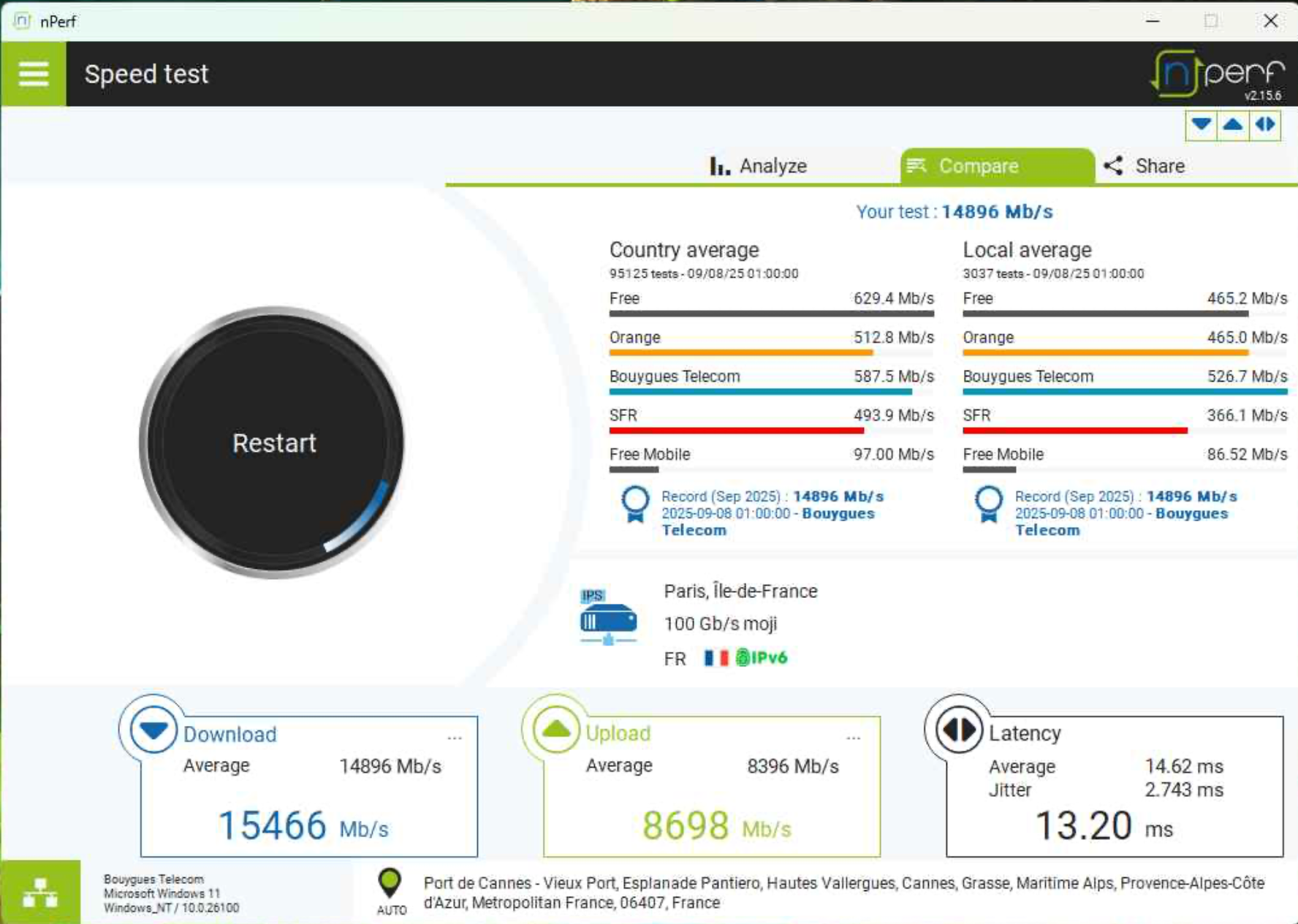 Latence : 13,20 ms logique en prenant en compte la distance Alpes-Maritimes/Paris.