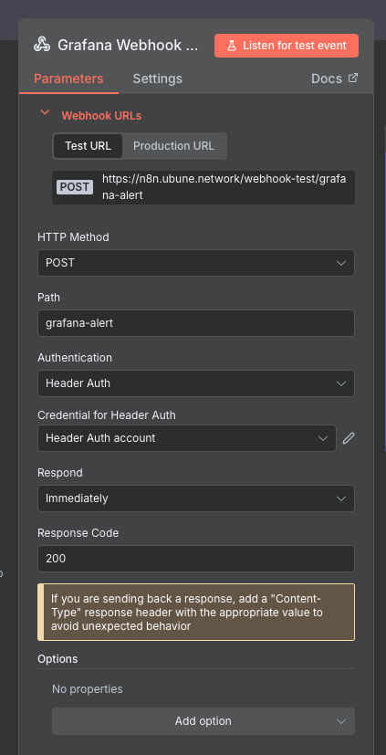 Un webhook, c'est tout simplement une url dédiée, ici n8n.ubune.network/webhook-test/grafana-alert,